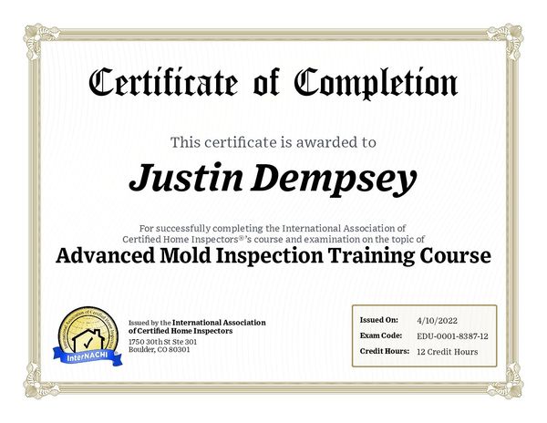 We have completed all required education and training needed to become a Certified Mold Inspector of InterNACHI.
